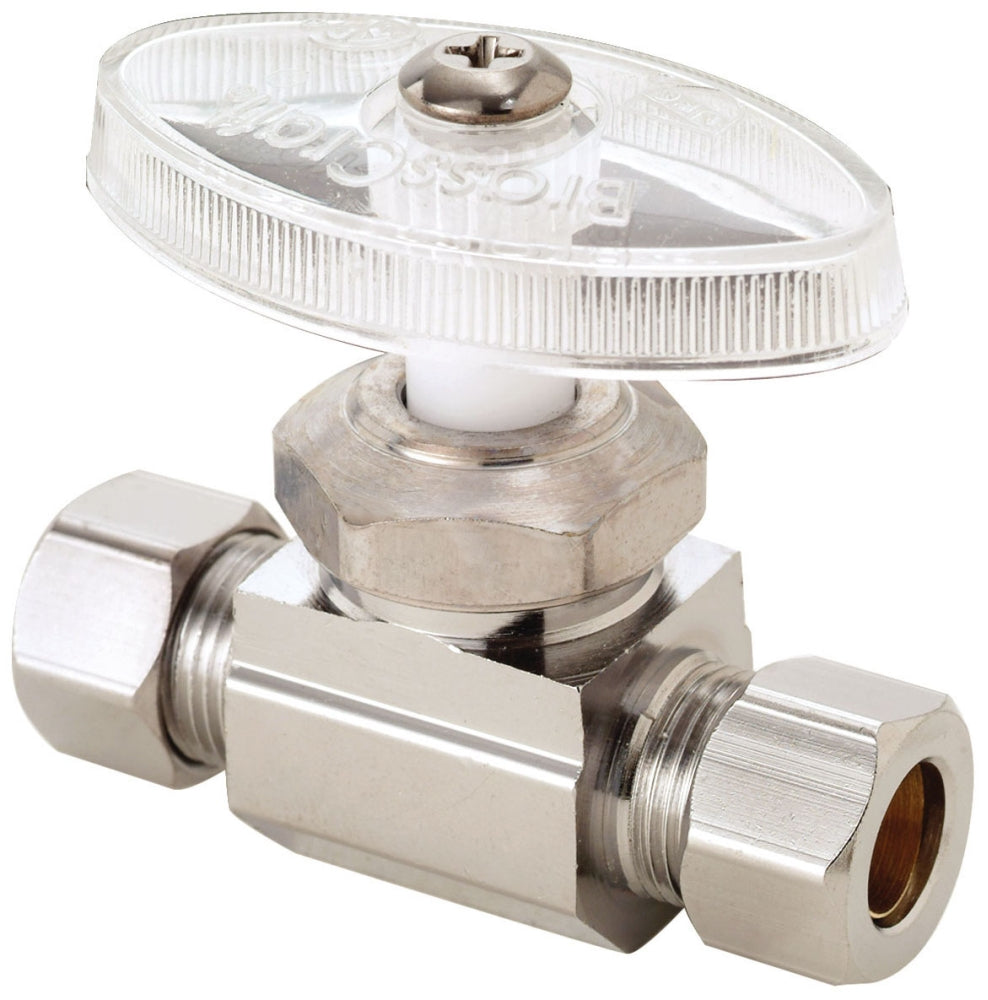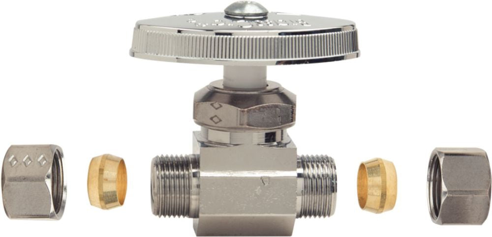 The BrassCraft OCR11X-C is a multi-turn straight stop valve designed for controlling water flow in residential and commercial plumbing systems. This valve features a 1/4 inch nominal compression inlet and a 3/8 inch OD compression outlet, making it suitable for various applications. It is manufactured from chrome plated brass, ensuring durability and corrosion resistance.