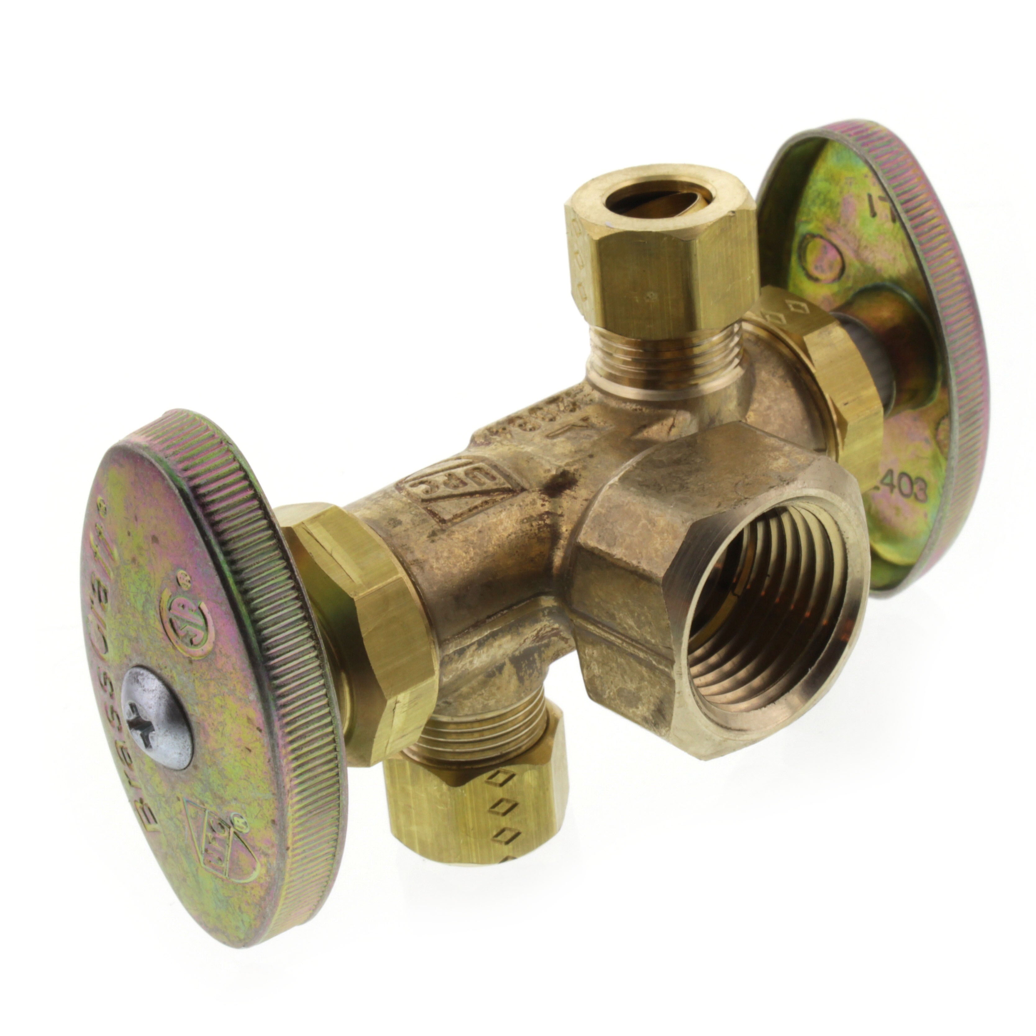 The BrassCraft R1701DVXR is a dual outlet, multi-turn angle supply stop valve suitable for residential water supply systems. This valve features a 1/2 inch FIP inlet and 3/8 inch OD compression outlets. It provides effective water flow control, making it ideal for connecting to dishwashers, ice makers, and water filters.