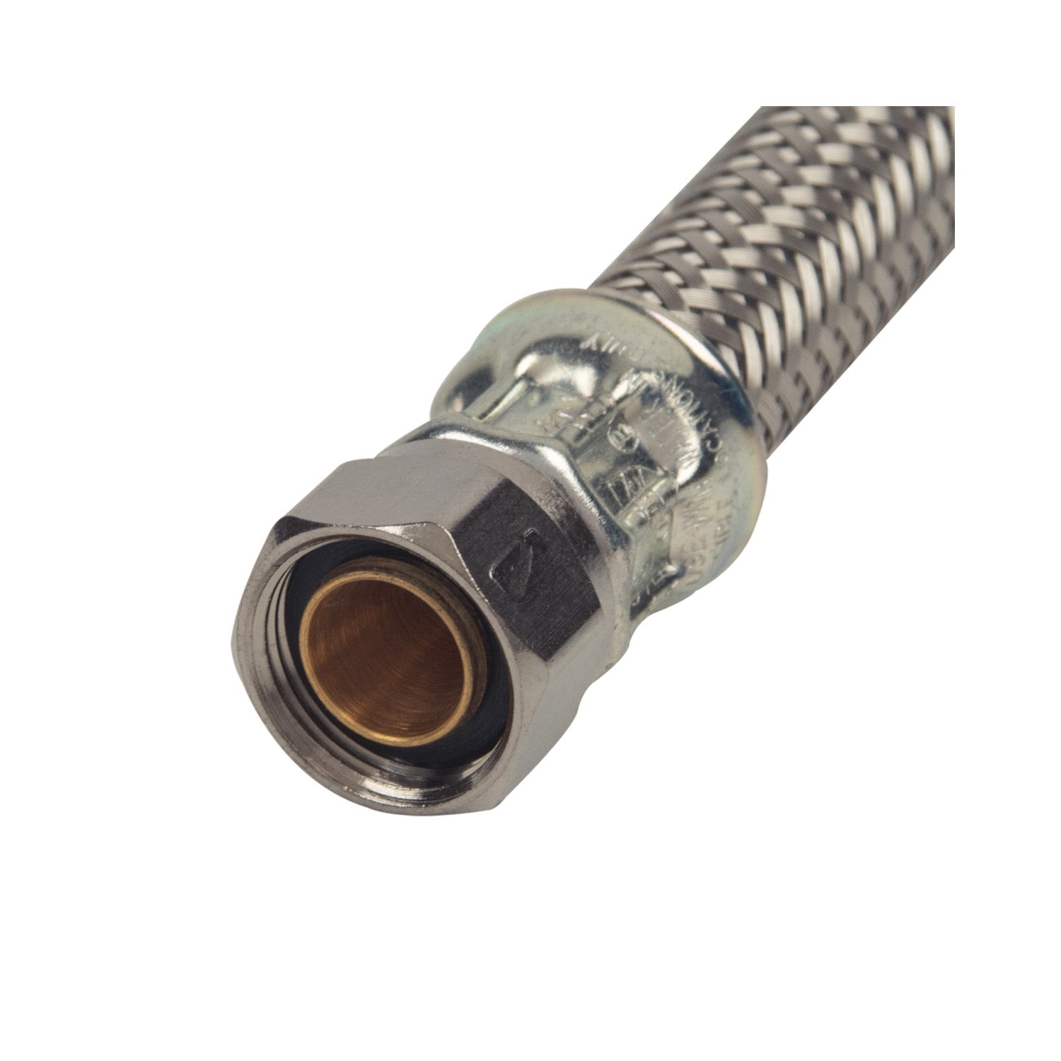 The BrassCraft S1-12DLMF is a flexible braided water connector designed for toilet applications. This product features a compression x ballcock connection style, ideal for connecting to a water supply in accessible locations. It measures twelve inches in length and operates with a maximum working pressure of 125 psi, making it suitable for potable water distribution systems.