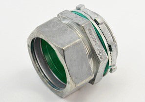The Bridgeport 254-RT2 is an EMT raintight compression connector designed for use with EMT conduit. This connector features a non-insulated construction with an internal sealing ring and a knockout gasket, which creates a durable raintight seal. It is made from die cast zinc with a ball burnished finish. This connector is suited for wet or damp environments, ensuring quality and reliability in challenging conditions.