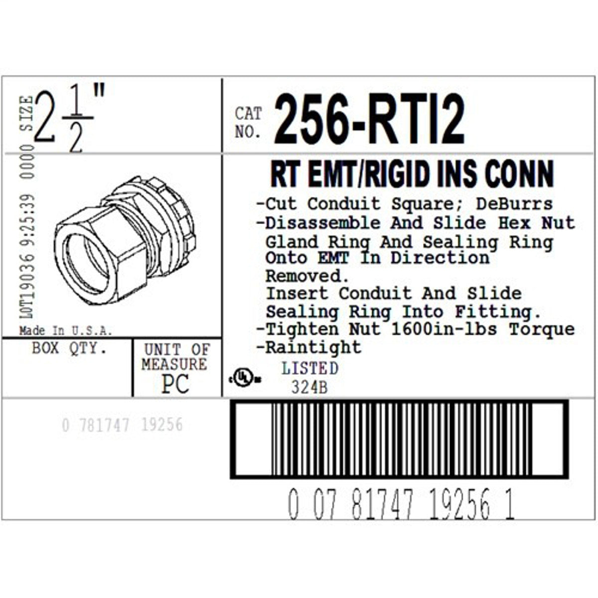 The Bridgeport 256-RTI2 is a rainedight insulated throat compression connector designed for use with EMT conduit. This product is ideal for creating a sealed connection between EMT conduit and junction boxes. It is made from die-cast zinc for durability.
