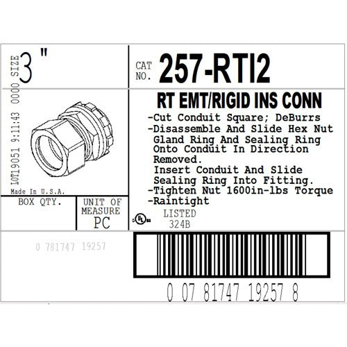 The Bridgeport® 257-RTI2 EMT Raintight Compression Connector is designed for use with EMT conduit. This connector features a unique internal sealing ring and knockout gasket that provide a reliable raintight connection. It is suitable for installations in damp or wet locations and helps contractors simplify their fittings without sacrificing quality.