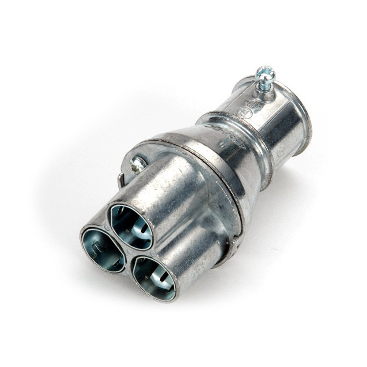 The Bridgeport 4357-DC is a set screw type transition fitting designed for commercial and institutional applications. This fitting connects one EMT conduit to three flexible conduits with diameters ranging from point forty-three to point sixty-one inches. Compared to traditional methods of conduit installation, this fitting significantly reduces labor costs. To install, remove the armor from the AC/MC/FMC cable, exposing the desired length of the conductors necessary for connection to the device box or enclosure. Use of anti-short bushings is advised for optimal performance. Tighten the steel screws for secure installation.