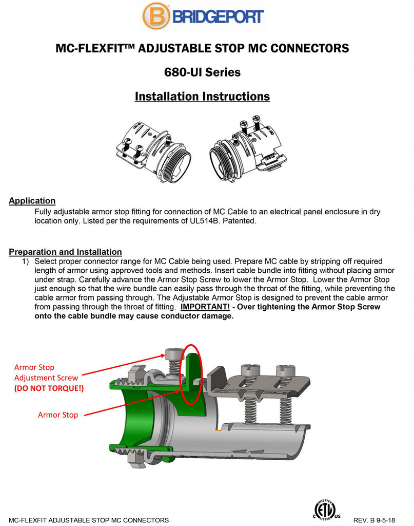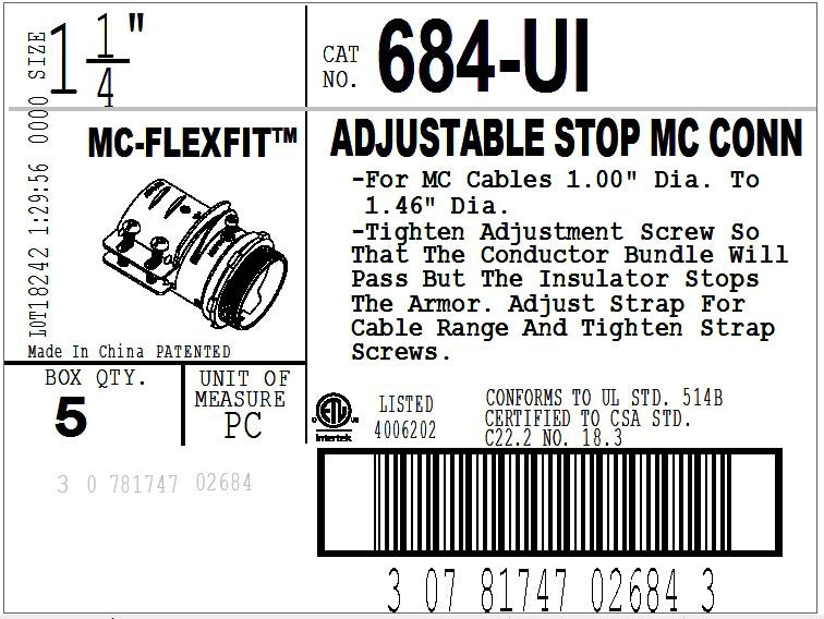 Bridgeport's 684-UI is an adjustable endstop connector for MC feeder cables. This connector features a one-piece armor stop for conductor protection. A two-position, two-screw hinge design allows for a wide range of cable sizes. The steel construction ensures durability and reliability for electrical applications.