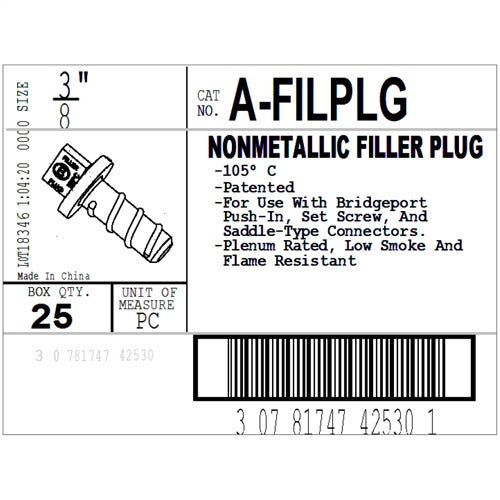 The Bridgeport A-FILPLG is a nonmetallic filler plug designed for use with various types of connectors. It is essential for installations where the fitting is in place but wiring is not yet connected. This product prevents dirt and debris from entering electrical raceways.