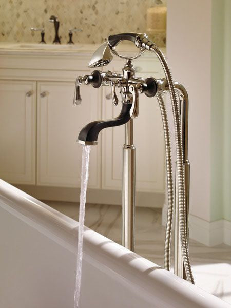 The Brizo T70210-PNLHP is a traditional two-handle freestanding tub filler body assembly trim designed for use without handles. This product features a polished nickel finish and solid brass construction. It integrates seamlessly with various tub models, including Baliza and Charlotte.