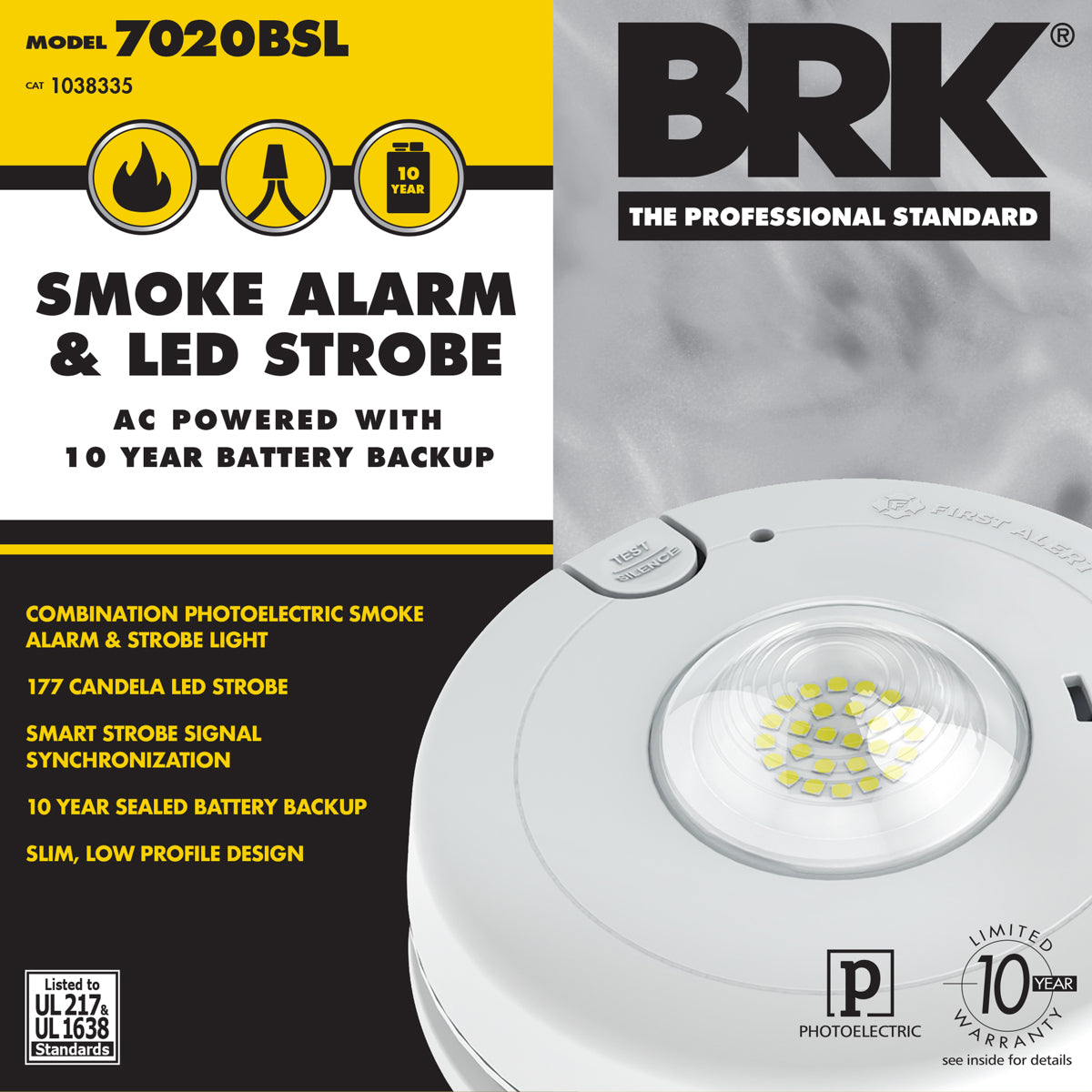 The BRK 1038335 is a smoke alarm designed for reliable detection and safety. It features a ten-year sealed lithium battery backup, ensuring continuous operation during power outages. The device incorporates a photoelectric sensor to reduce false alarms, making it suitable for various environments. An integrated 177 candela LED strobe provides a visual alert during alarms, enhancing safety measures.