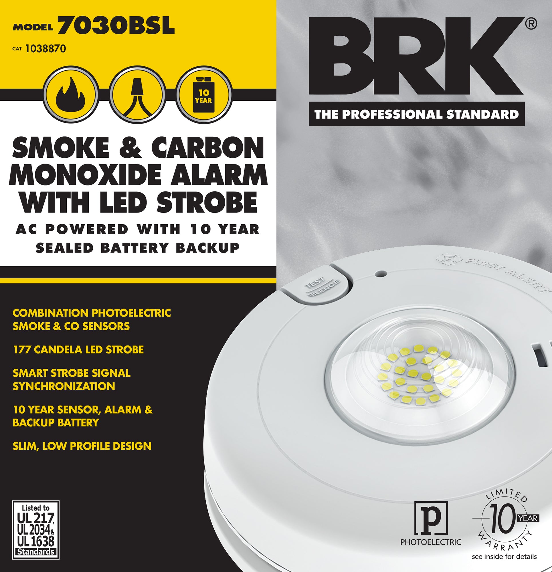 The BRK 1038870 Smoke/CO Combo Alarm provides safety with smoke and carbon monoxide detection. This unit features a sealed lithium battery backup for reliable operation. The integrated LED strobe light enhances visibility during alarms.