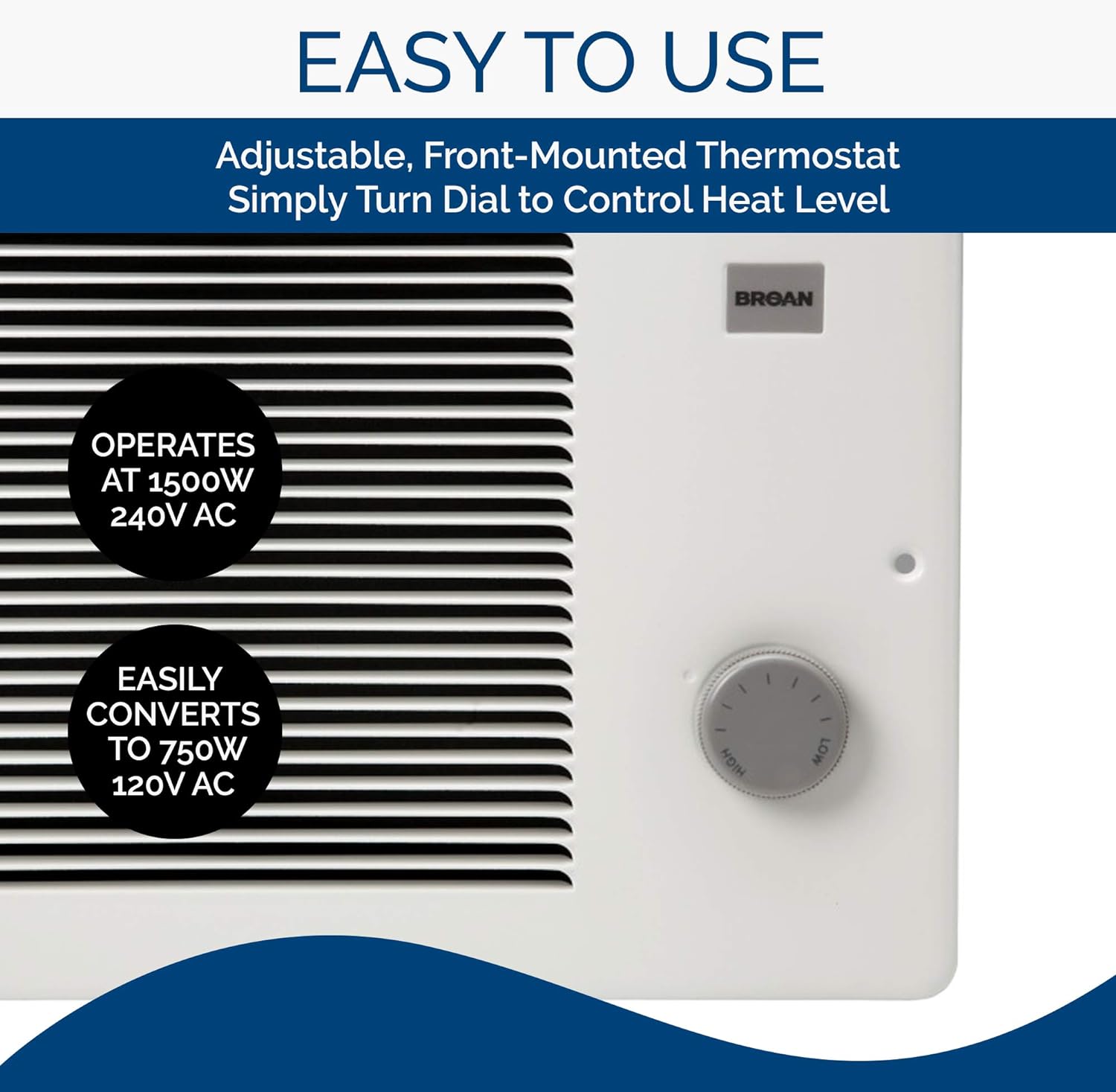 The Broan-NuTone Wall Heater, MPN 174, is designed for efficient space heating. It features a white grille and an adjustable thermostat, providing flexibility with 750W and 1500W power options. Suitable for various room types, especially bathrooms.