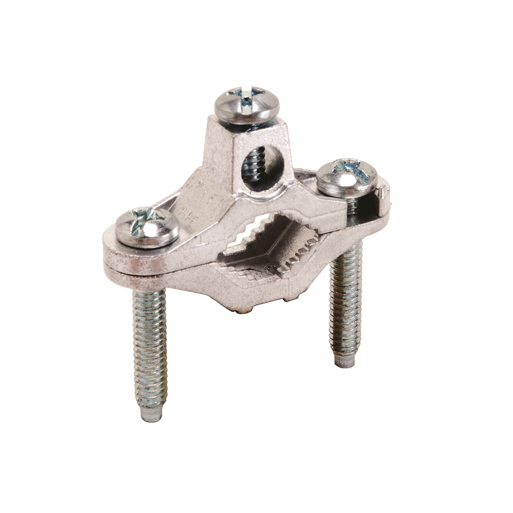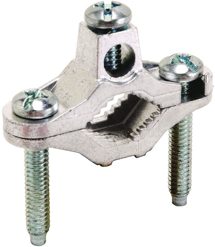 The Burndy CZ11 is a grounding clamp designed for connecting cables to water pipes. This product accommodates conductor sizes ranging from ten to two AWG and is suitable for water pipes sized from one half to one inch. The clamp is constructed from die-cast zinc and comes with zinc-plated screws for durable installation.