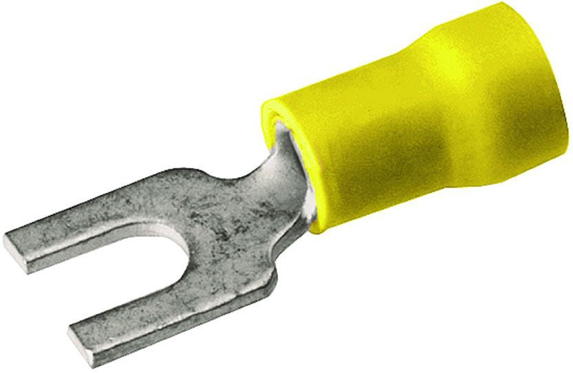 Burndy TP1010FBG25 is a fork tongue terminal designed for use with conductors sized ten to twelve AWG. This terminal features a smooth entry design, providing ease of installation. The product is rated for six hundred volts and is made of high-quality copper with electro-tin plating for durability.
