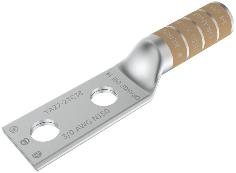 Burndy YA272TC38 is a compression cable lug suitable for wire termination applications. This product supports conductor sizes of three aught AWG and is designed for heavy-duty performance up to thirty-five kilovolts. It features a long barrel design with internal chamfer for easier installation.