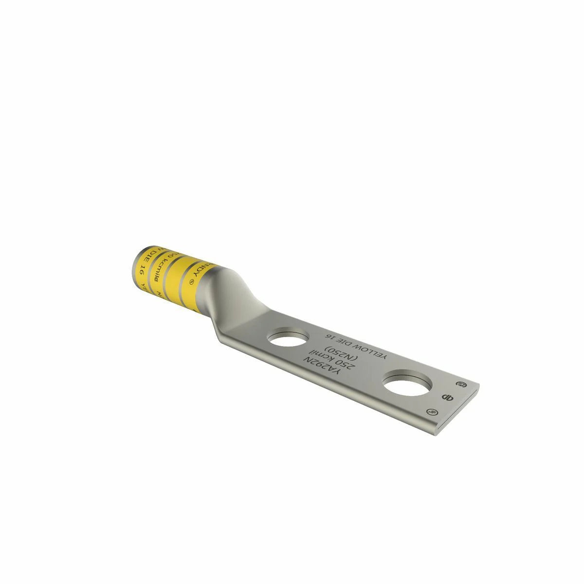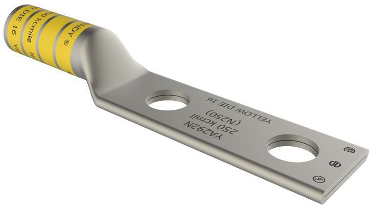 The BURNDY YA292N is a compression terminal designed for wire termination. It is suitable for use with copper conductors sized 250 kcmil. This terminal offers a voltage rating from six hundred volts to thirty-five kilovolts. The device has a long barrel with a straight, chamfered entry for ease of installation.