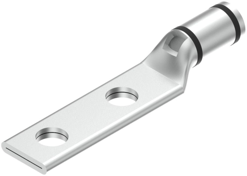 The Burndy YAV26L2TC38FX is a two-hole compression cable lug designed for wire termination. It is suitable for flexible copper cables and rated for voltages up to thirty-five kilovolts. This product is made in the United States and is UL and CSA approved.