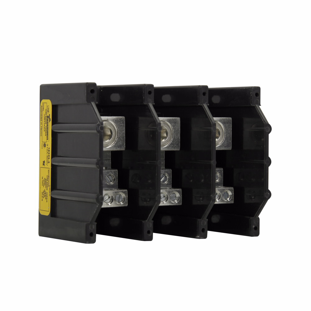 The Bussmann Series 16323-3 Power Terminal Block is designed for effective power distribution. This block operates at 600 volts AC and DC with a maximum current rating of 310 amps. It features three poles for versatile connections. The terminal block is constructed with a molded thermoplastic base and includes a tin-plated aluminum connector for reliable conductivity.