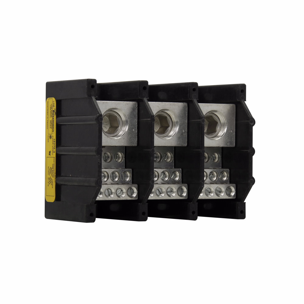 Bussmann offers the model 16376-3 terminal block for power distribution. It operates at six hundred volts AC and DC with a current rating of four hundred twenty amps. This three-pole block is built with a molded thermoplastic base and includes a tin-plated aluminum connector.