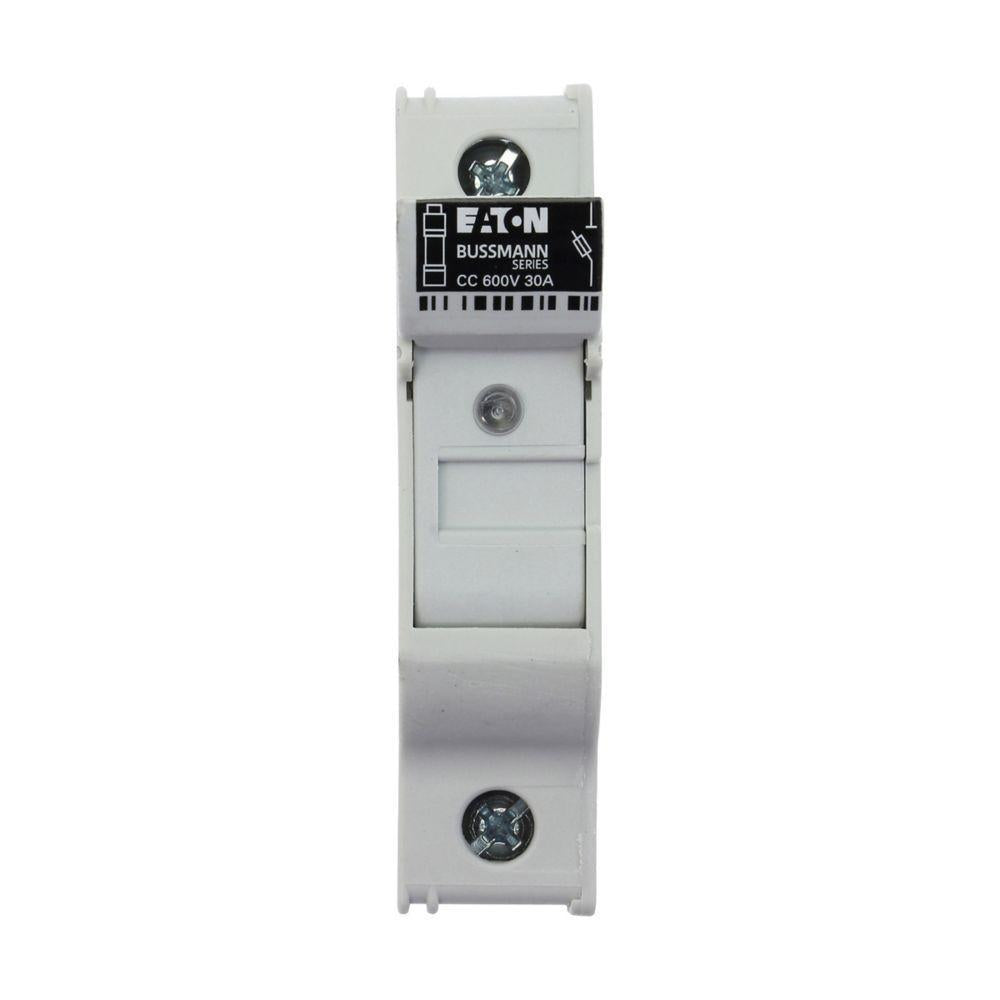 Bussmann CHCC1DIU is a finger safe modular fuse holder designed for safe operation with UL Class CC and midget fuses. This fuse holder supports a voltage rating of 48 VDC and is rated for a 30 A current. The modular design allows for easy installation on DIN rail systems. The fuse holder can accommodate wire sizes from 18 AWG to 4 AWG.