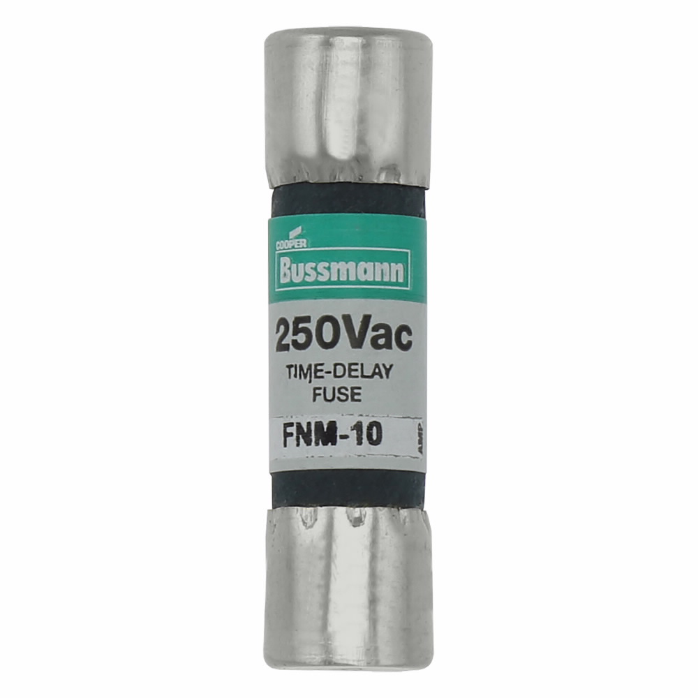 Bussmann FNM-10 is a time delay fuse rated for ten amps at two hundred fifty volts AC. This fuse suits various applications, providing reliable circuit protection for lighting and general-purpose circuits.