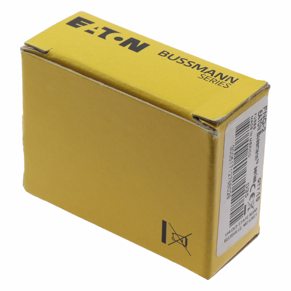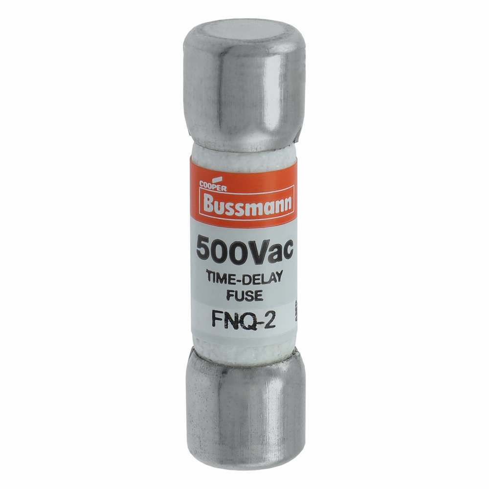 The Bussmann FNQ-2 is a time delay fuse designed for various applications. It has a rating of two Amperes at five hundred Volts AC. This fuse is classified as supplemental and has a ten kAIC interrupt rating. It features a cartridge body that allows for easy installation.
