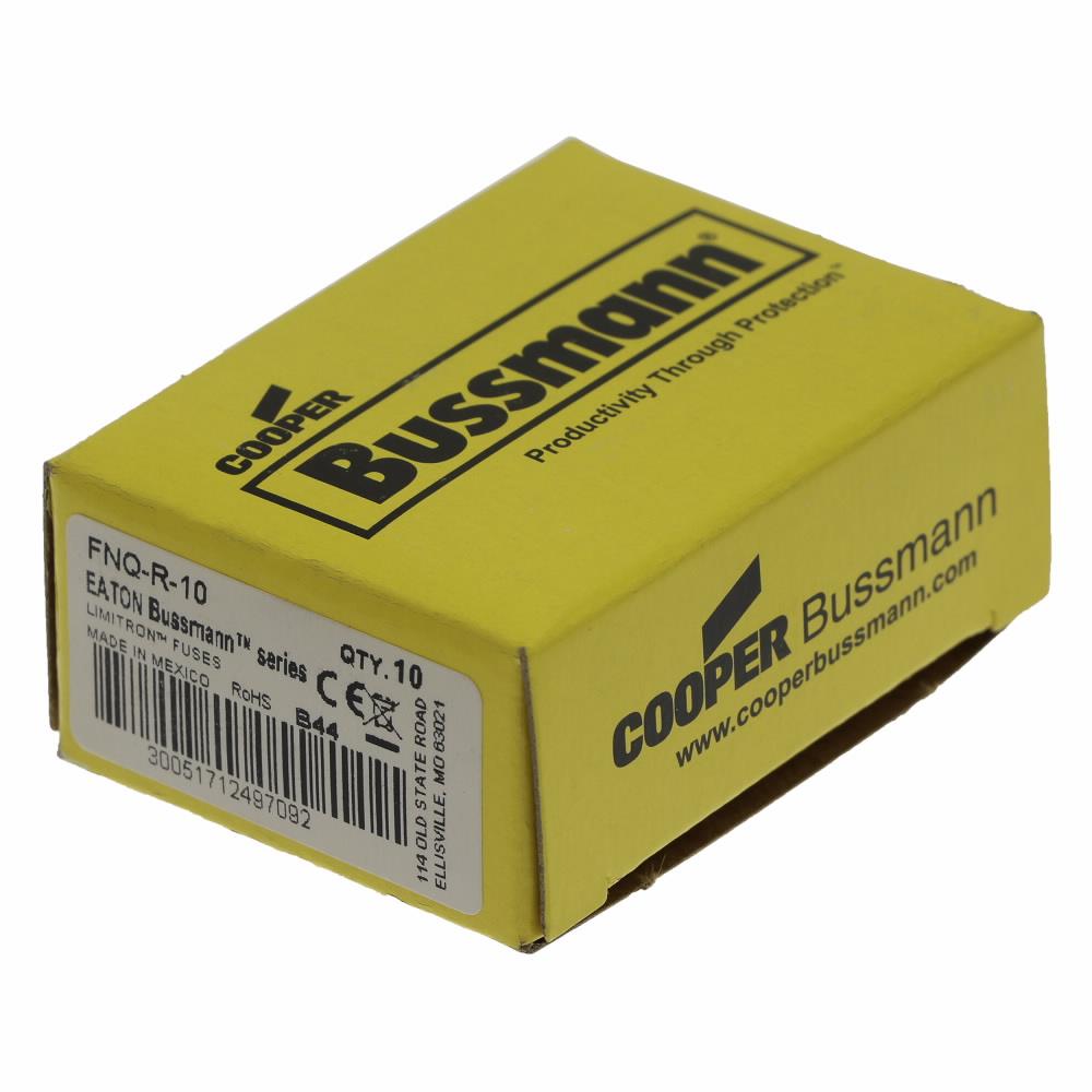The Bussmann FNQ-R-10 is a current limiting time delay fuse designed to offer reliable protection for electrical circuits. This fuse operates at ten amperes and is rated for six hundred volts with a two hundred kAIC interrupting capacity. Its cylindrical body makes it suitable for various applications including control transformers and industrial equipment.