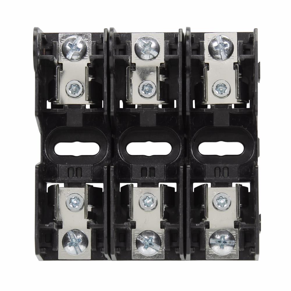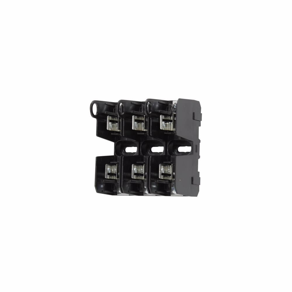 The Bussmann JM60030-2SR Modular Fuse Block is manufactured by Eaton. It combines a fuse block with a power distribution block. This design saves space by using up to sixty-five percent less panel space. It reduces inventory costs and cuts installation time by thirty-three percent.