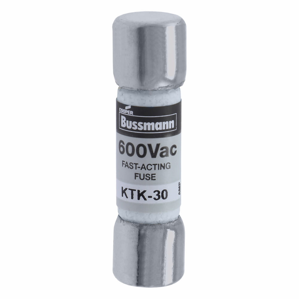 The Bussmann KTK-30 is a fast-acting supplemental fuse with a voltage rating of six hundred volts and an amperage rating of thirty amps. This fuse is designed for effective protection in control circuits, lighting circuit protection, and meter circuits. It features a non-indicating function and has an interrupt rating of one hundred kiloamperes. The dimensions of the fuse are thirteen thirty-seconds inches in diameter by one and a half inches in length.