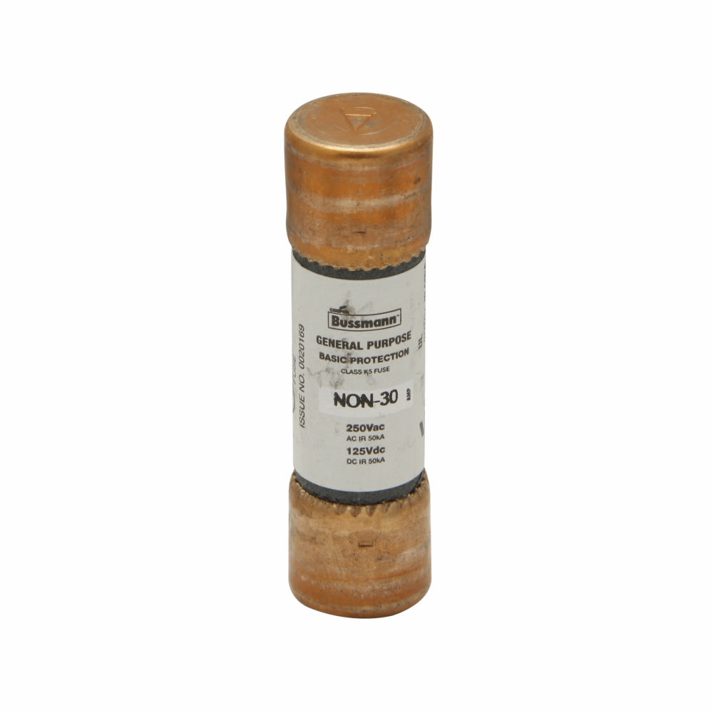 The Bussmann NON-1 is a one-time fuse designed for light-duty circuit locations. This fuse provides protection in circuits where a considerable amount of temporary surges are not present. The NON-1 is a non-indicating, non-current limiting fuse rated at one ampere and operates at a voltage of 250 VAC and 125 VDC. With a cylindrical body measuring nine-sixteenths inch in diameter and two inches in length, it is engineered for reliability in power distribution systems.