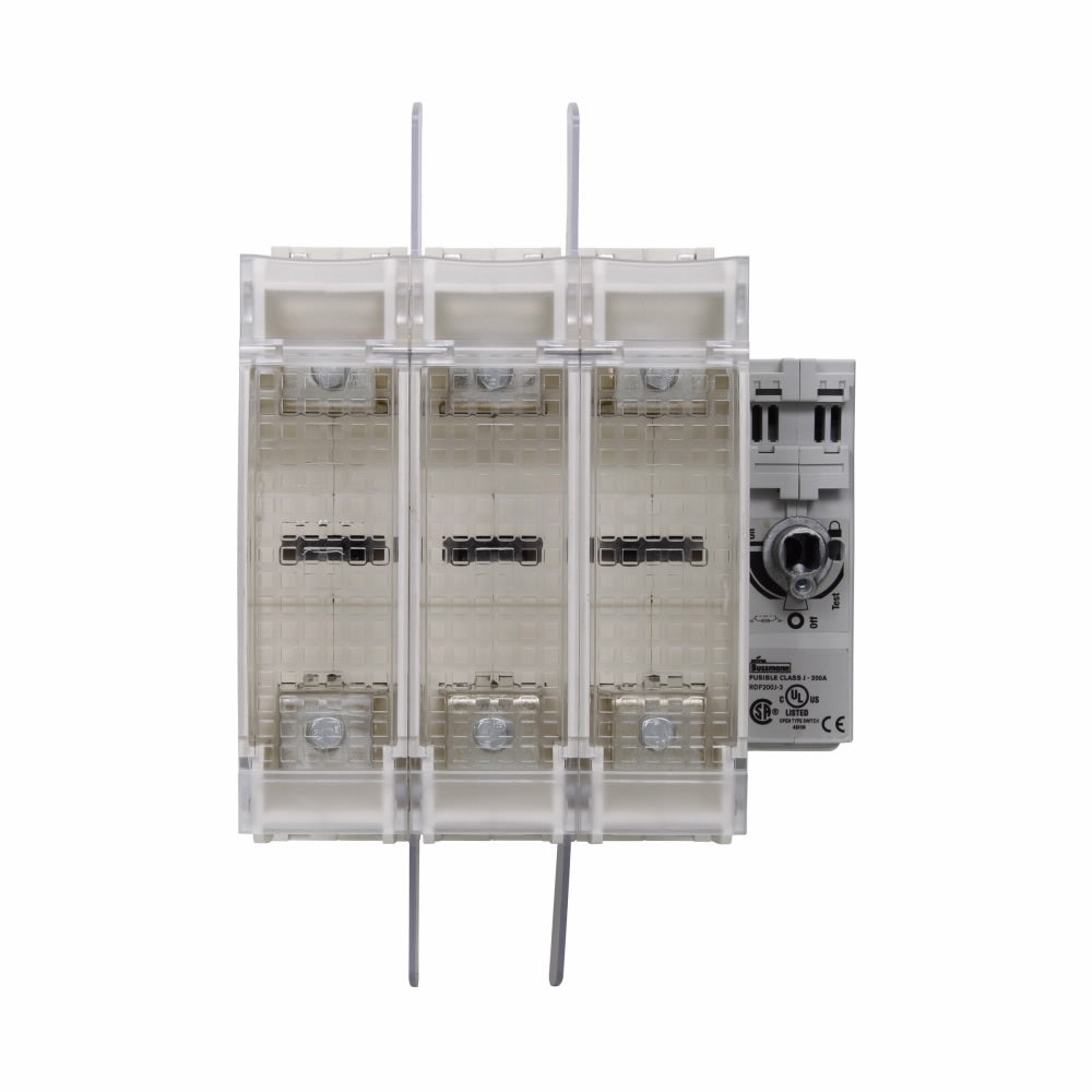 The Bussmann RDF200J-3 is a rotary disconnect switch designed for use in electrical systems. This product is suitable for applications requiring a fused disconnect switch. The switch is rated for two hundred amperes and operates at six hundred volts, making it ideal for commercial and industrial applications.