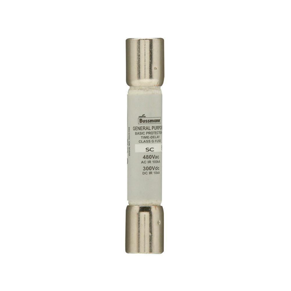 The Bussmann SC-50 Class G Fuse is designed for current-limiting and time-delay applications. It features a rating of fifty Amperes and can be used in both 480 Volt AC and 300 Volt DC circuits. This fuse offers 10 kA interrupt protection at 300 VDC and 100 kA at 480 VAC. It has non-indicating characteristics and employs a ferrule end connection type.
