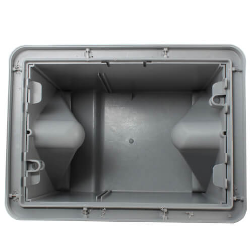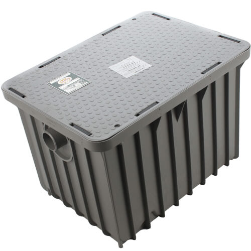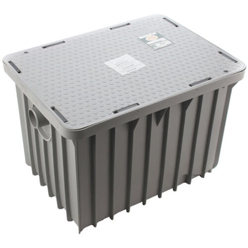 This grease interceptor is suitable for installations in floor, semi-recessed, or fully recessed configurations. It includes a recessed silicone seal to prevent odors and has an easy open latch cover for maintenance.