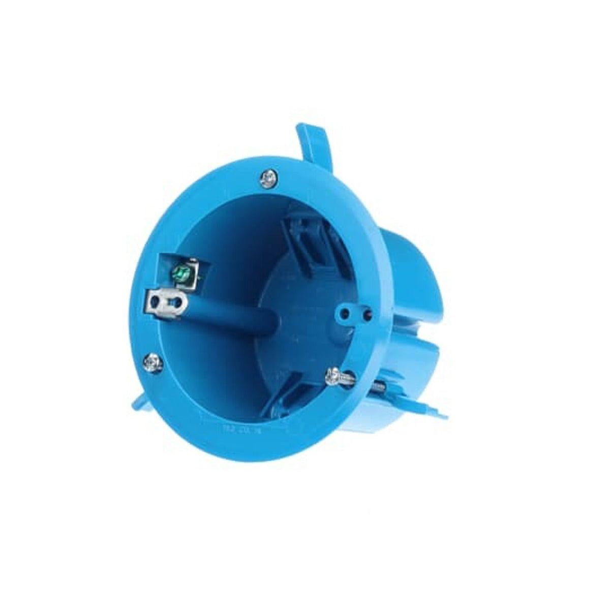 CARLON B618RPR is a round old work box with a volume of eighteen cubic inches and a diameter of four and a quarter inches. Designed for easy installation, the box is made from durable polycarbonate, suitable for various electrical applications. It features unique swing clamps for secure mounting. This product is made in the United States and is ideal for non-metallic installations.