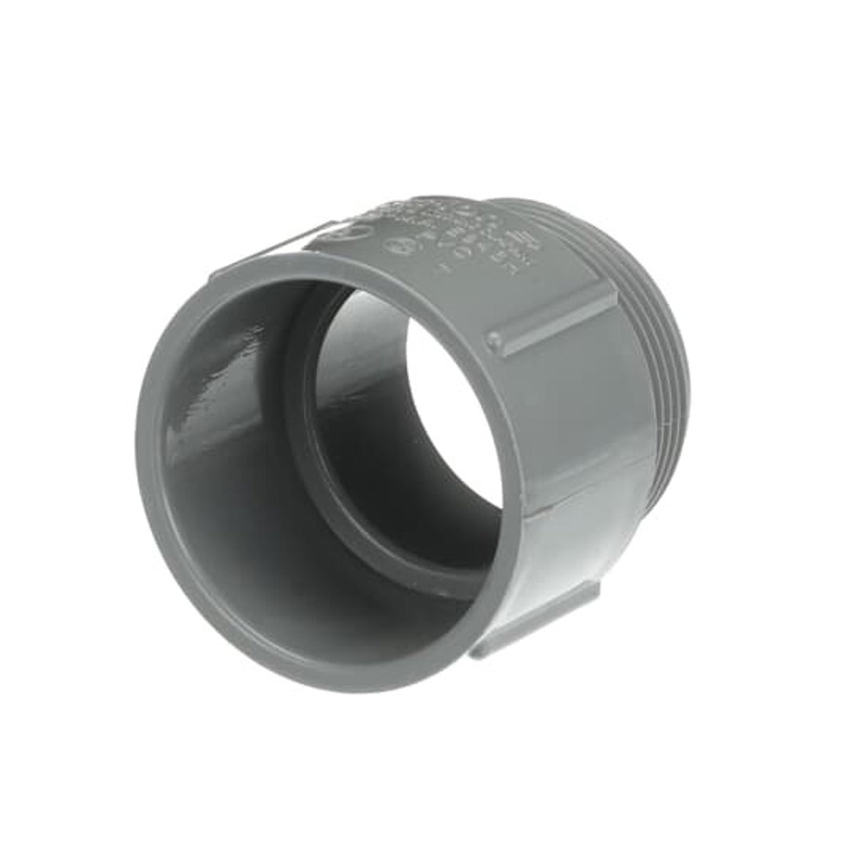 The CARLON E943H is a male terminal adapter designed for rigid non-metallic conduit applications. This connector is made from PVC and is suitable for use with Schedule 40 and 80 conduit systems. With a length of two point one zero five inches and an outer diameter of two point one eight eight inches, this product meets various installation needs.