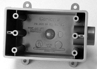 The CARLON E9801FN is a non-metallic one gang deep device box with a cubic capacity of twenty-five cubic inches. This product is designed for use in installations requiring additional wiring capacity or dead-end terminations. It is made by CARLON, a brand known for its quality electrical products. This device box is compatible with various covers and accessories, making it versatile for different applications.