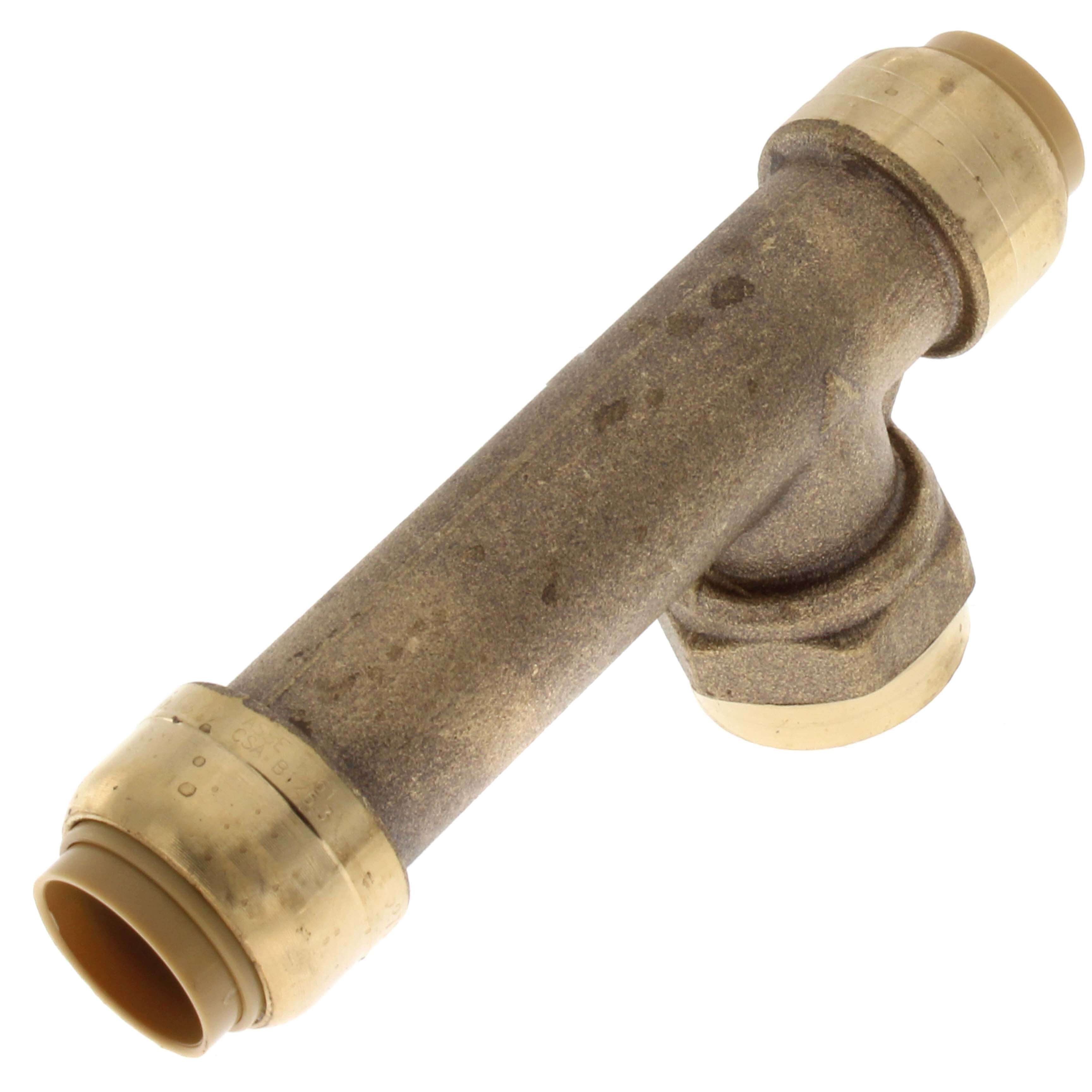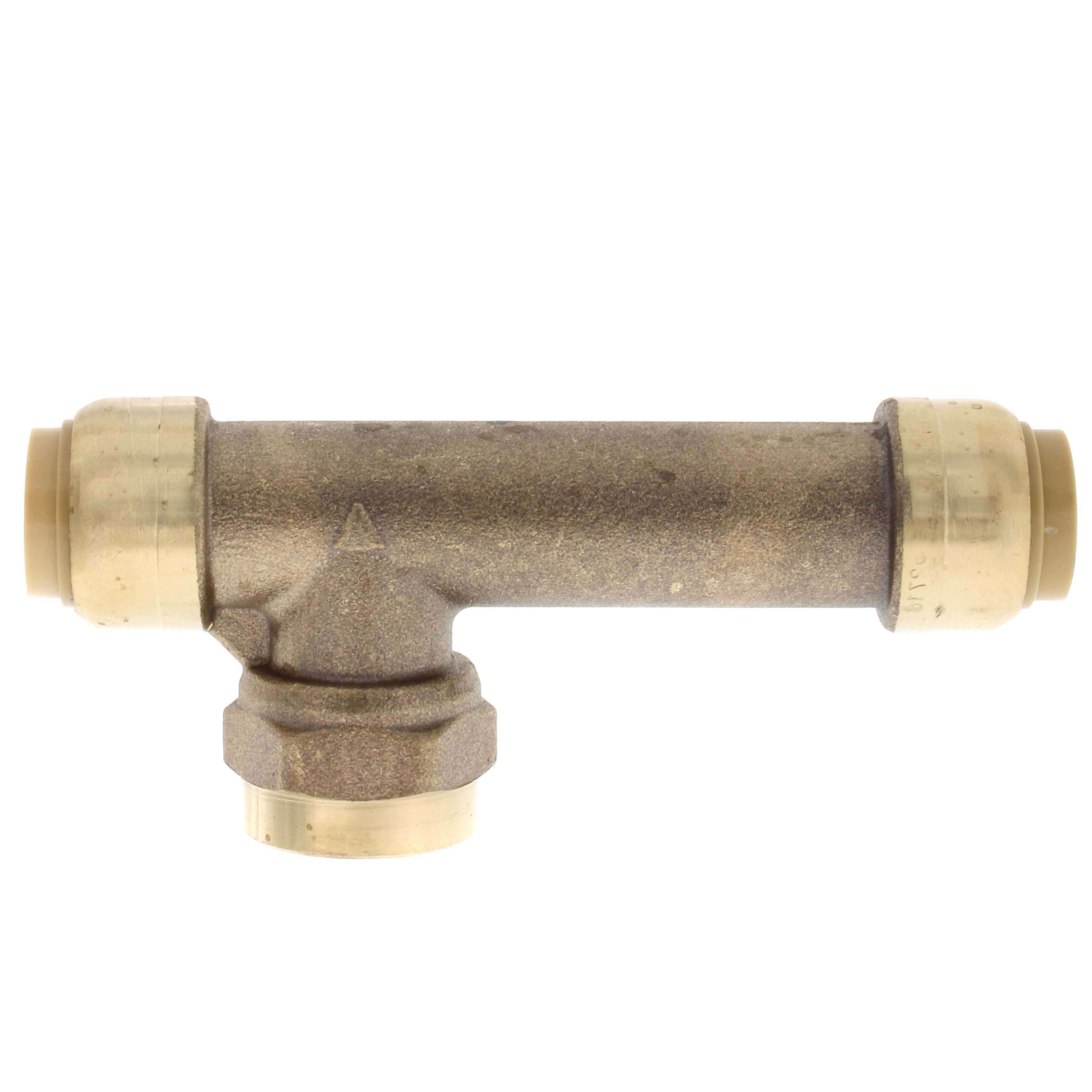 The CASH ACME U3482LF is a lead-free brass slip tee designed for plumbing connections. This fitting offers an FNPT threaded end and is ideal for use with copper tubing, CPVC, and PEX piping. It is certified for a maximum pressure of two hundred psi and a temperature rating of two hundred degrees Fahrenheit. The SharkBite design provides an instant push-fit connection, making installation fast and efficient.