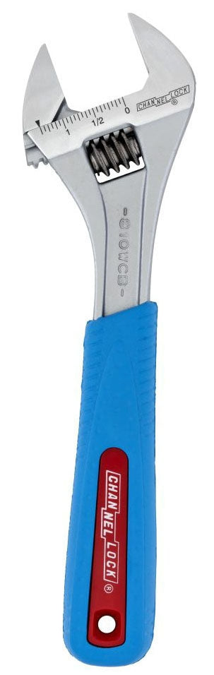 The Channellock 810WCB is a 10-inch adjustable wrench designed for a variety of mechanical tasks. This tool features a measurement scale and a jaw capacity of one point thirty-eight inches, making it suitable for gripping a wide range of nuts and bolts.