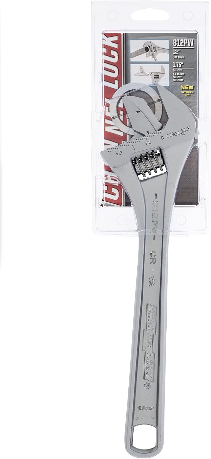 The Channellock 812PW 12-inch Reversible Jaw Adjustable Wrench/PIPE Wrench is designed for versatile use on both bolts and round stock. Made from chrome vanadium steel, this wrench is durable and reliable.