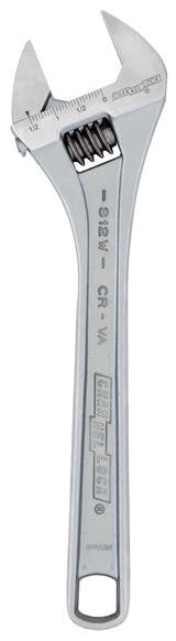 The Channellock 812W is an adjustable wrench designed for a variety of tasks. This tool features wide jaws that offer extra capacity for handling larger nuts and bolts. It has longer and thinner jaws to provide access in tight spaces. Measurement scales are laser-engraved on the tool, allowing for easy sizing of nuts, pipe, and tube diameters.