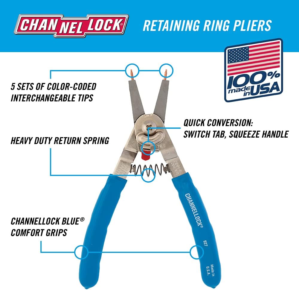 The Channellock 927 Snap Ring Plier is a precision tool built with quality and reliability in mind. This 8-inch plier is designed for professional use and includes five pairs of interchangeable tips. Ideal for working with snap rings and retaining rings.