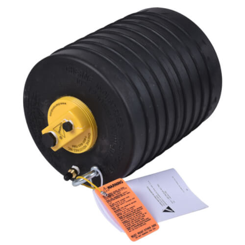 The Cherne Muni-Ball 10 in. Plug, MPN 262110, features a full bypass system, allowing for effective testing and monitoring of piping systems. This product is suitable for both residential and commercial applications.