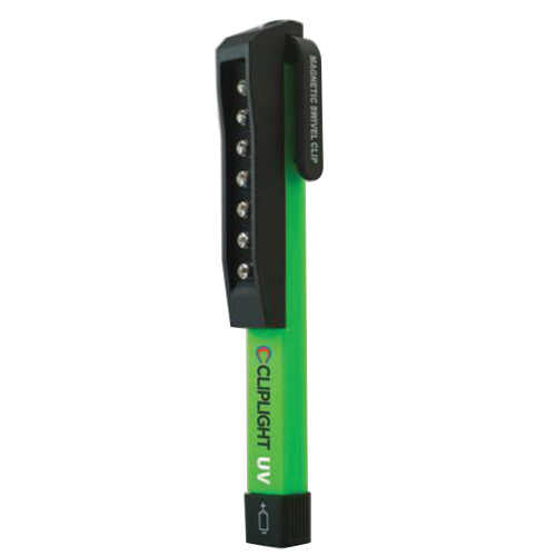 Cliplight introduces the 89DC UV Pocket Light. This portable light features seven high intensity ultraviolet LEDs. It has a magnetic base and a swivel clip for convenient attachment. The product operates on three AAA batteries, which are included. No special glasses are necessary to use this light.