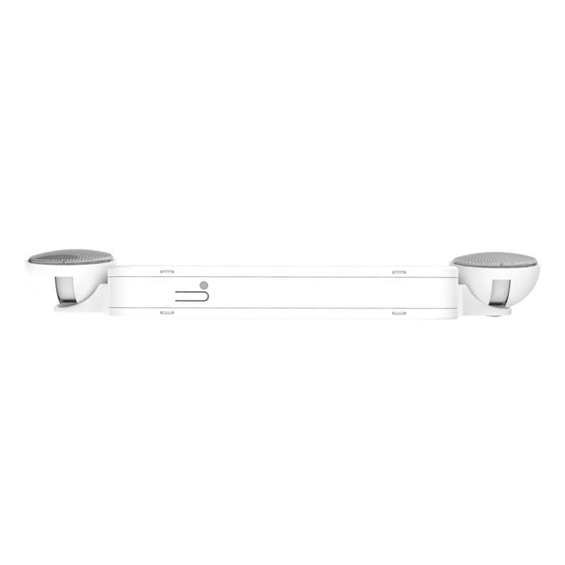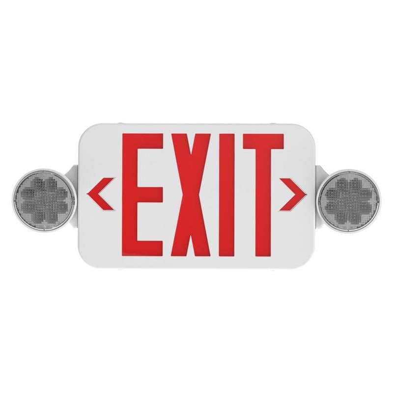 The Compass CCR exit and emergency light, model CCR, combines an exit sign with emergency lighting. This fixture features red letters and two adjustable LED lamp-heads for effective illumination. The housing is made from high-impact, UL flame-rated thermoplastic, ensuring durability. The assembly requires quick and easy installation with a snap-together design and removable chevrons.