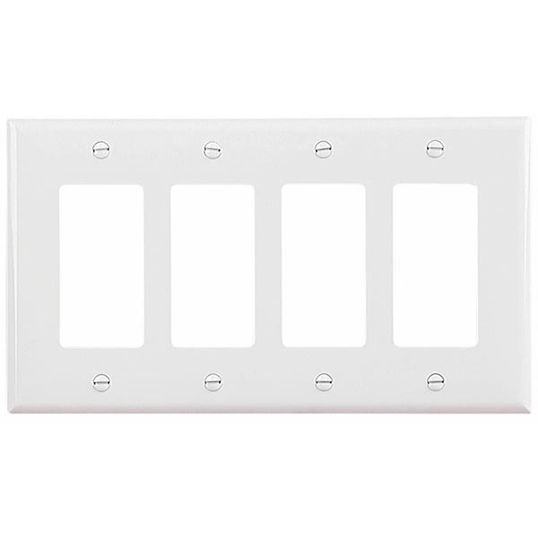 The Cooper Wiring Devices PJ264W is a mid-sized wallplate suitable for four-gang configurations. This wallplate is constructed from polycarbonate, providing durability and impact resistance. The white color fits standard decor and is suitable for various applications.
