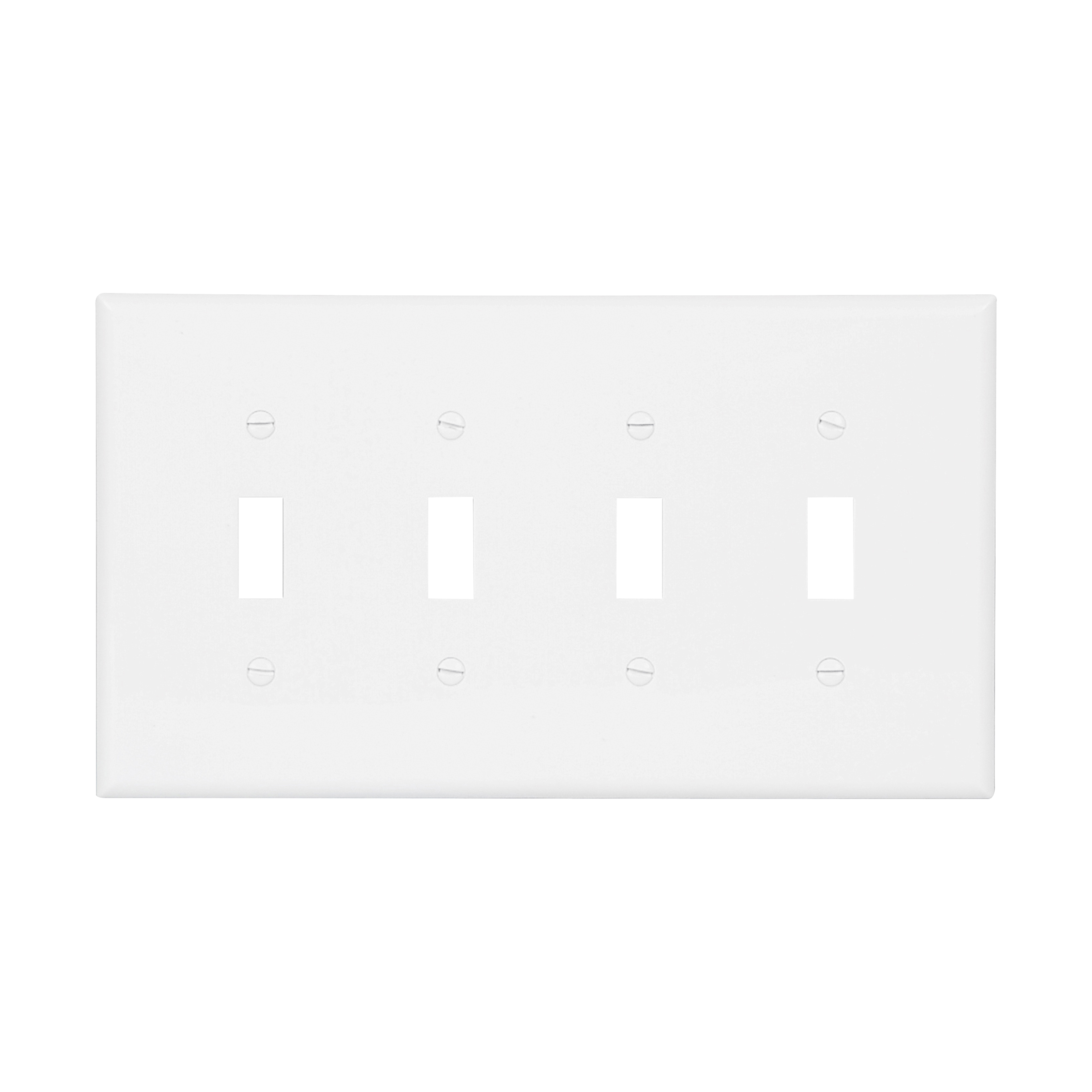 The Cooper Wiring Devices PJ4W is a mid-size screwless standard wallplate designed for four gangs. It is made from durable polycarbonate and is suitable for residential and commercial use. The wallplate fits toggle switches and offers an easy installation process with included mounting screws.