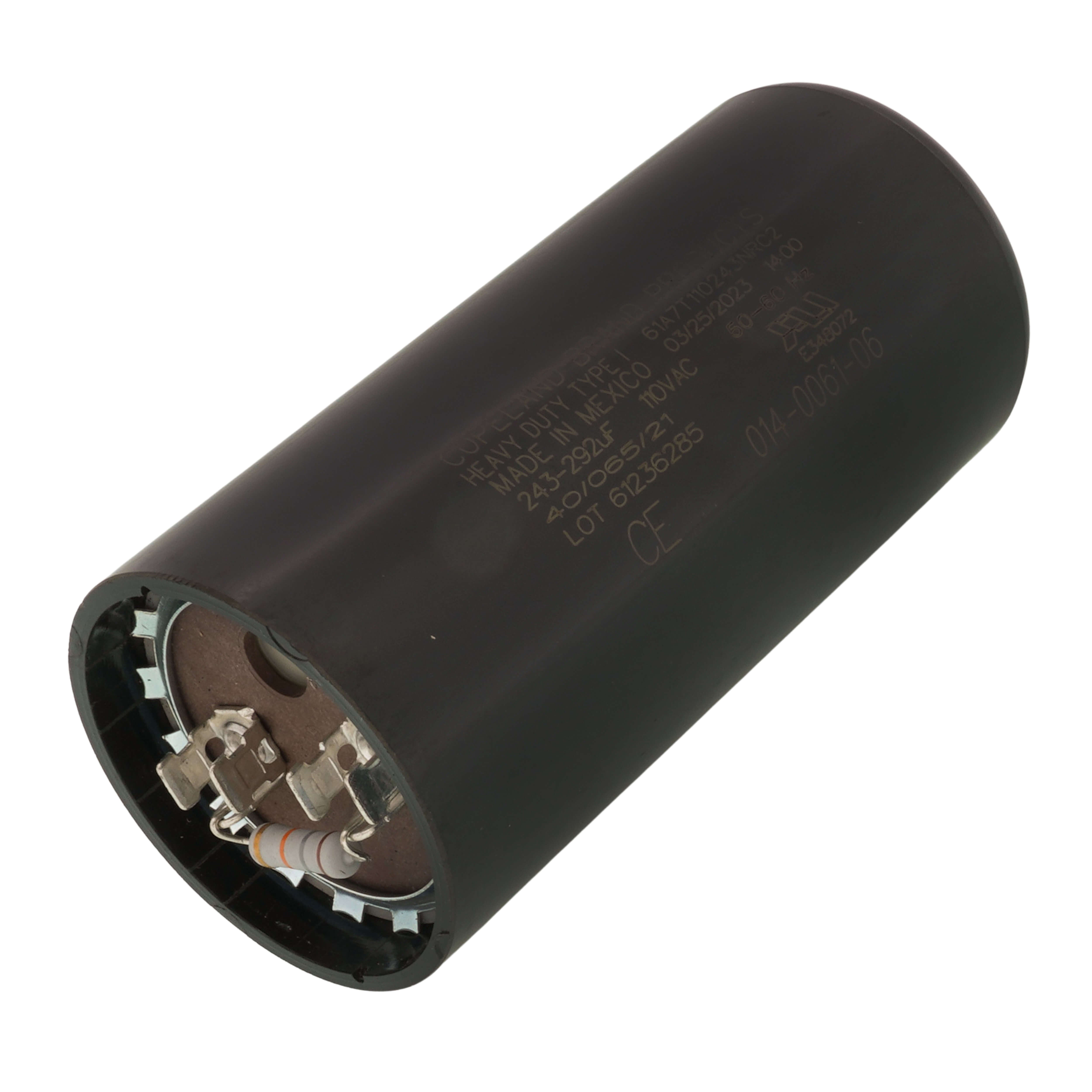 This Copeland start capacitor is model number 914-0008-57. It provides efficient starting power for equipment with its capacitance of 243-292 MFD and an operating voltage of 115V. The lightweight design makes installation straightforward. It is compliant with industry standards for durability.