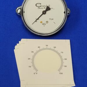 The Crandall 2422-001-CS&S Receiver Gauge measures pressure effectively with a range of three to fifteen PSIG. This two and a half inch gauge is suitable for various applications in HVAC and refrigeration systems. Designed for easy attachment, it provides accurate pressure readings for monitoring system performance.