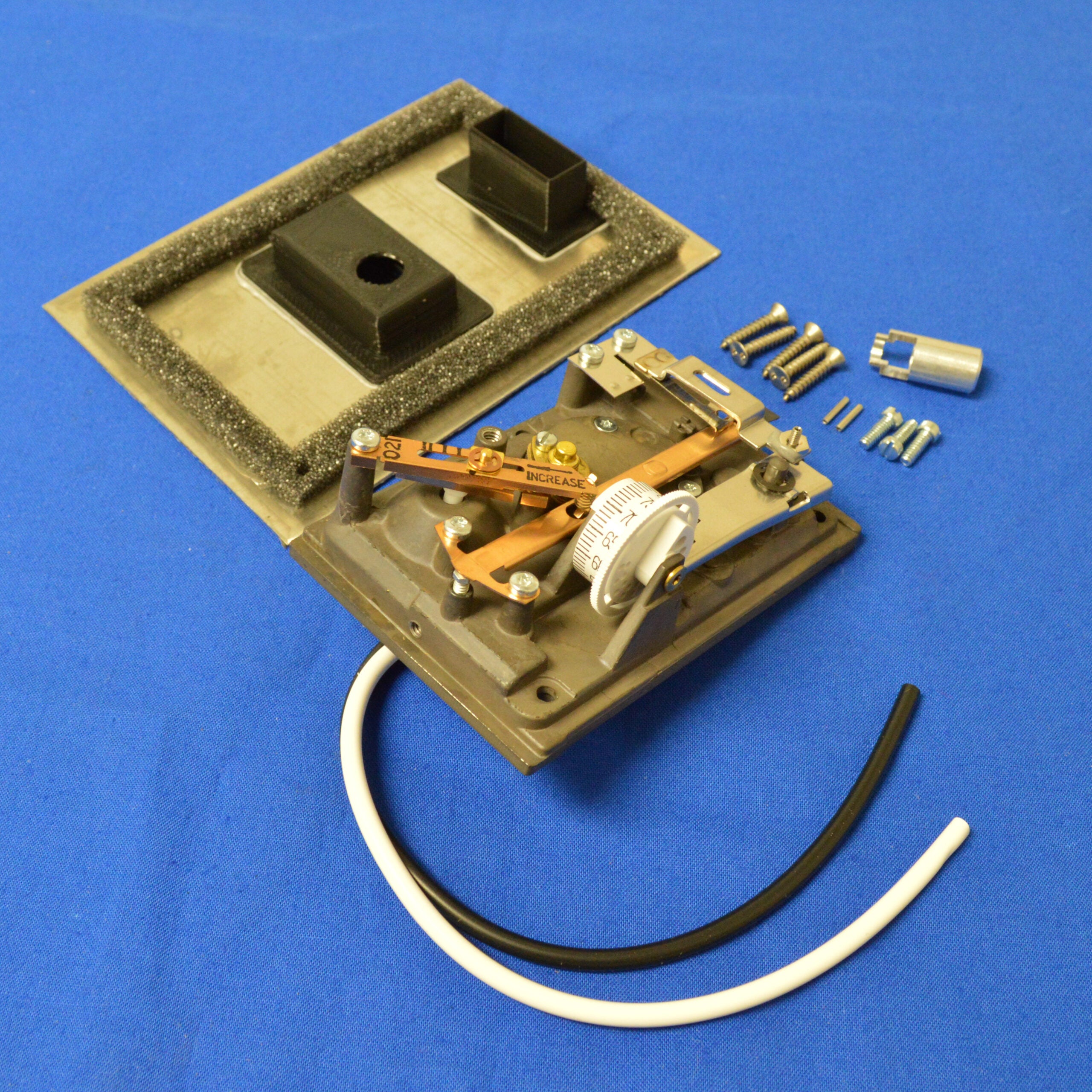 The Crandall TK-1101-600-CS&S is a reverse acting pneumatic room thermostat. It operates within a temperature range of fifty-five to eighty-five degrees Fahrenheit. This device is designed to control room temperature through pneumatic methods. It requires the AT-509 aspirating unit for proper function.