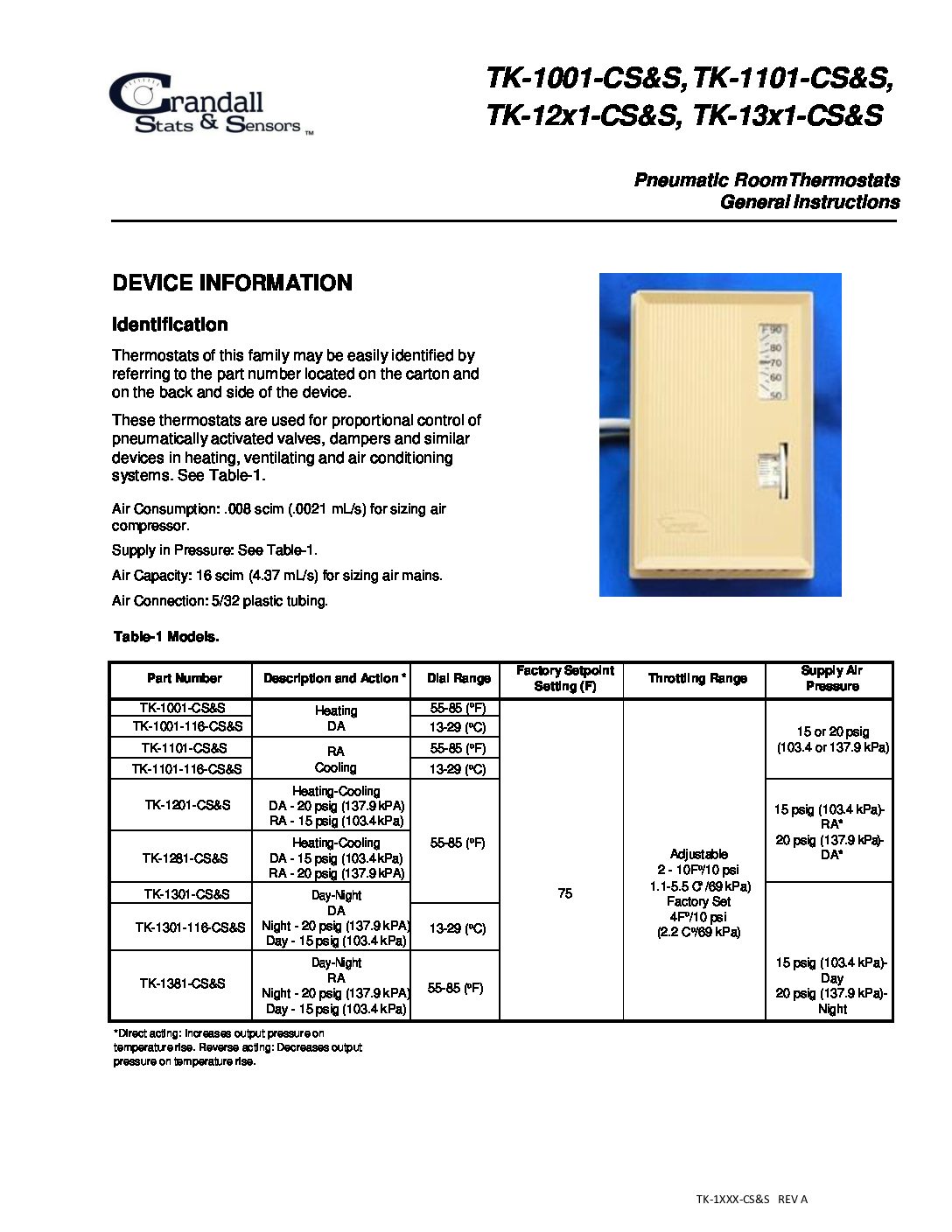The Crandall TK-1201-0-CS&S is a single temperature pneumatic thermostat designed for two-pipe systems. It operates at a 15 PSIG return air setting and a 20 PSIG duct air setting. This thermostat is effective within a temperature range of fifty-five degrees Fahrenheit to eighty-five degrees Fahrenheit.