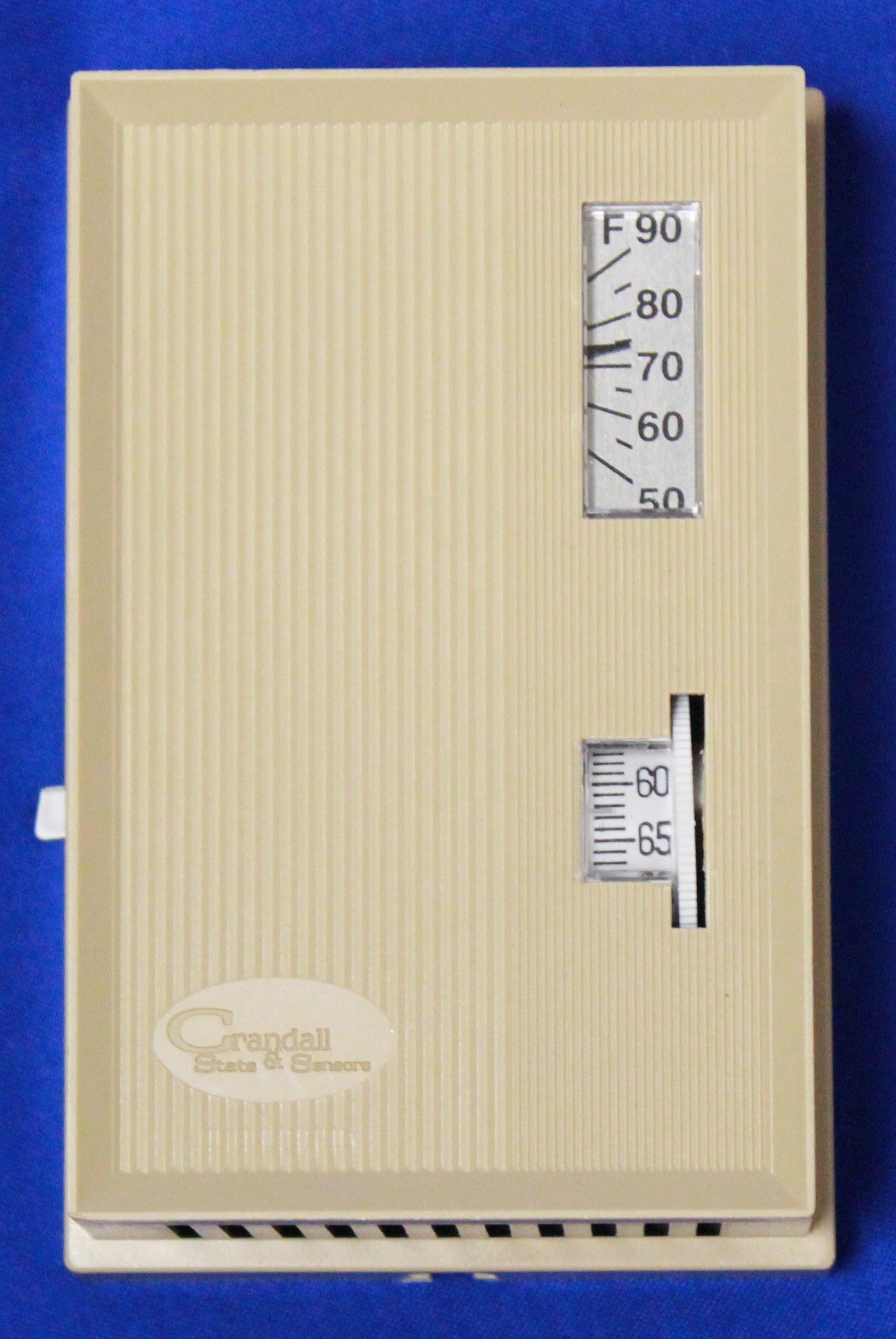 The Crandall TK-1381-0-CS&S is a pneumatic thermostat designed for control in heating and cooling systems. It features a single temperature setting and allows for manual override, making it suitable for various applications. This model operates within a range of fifty-five to eighty-five degrees Fahrenheit and supports two or three pipe systems.