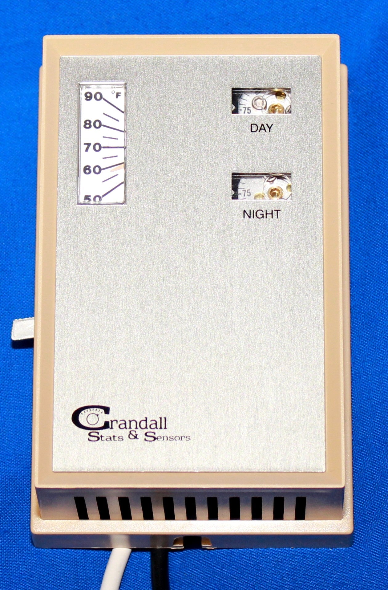 The Crandall TK-1761-CS&S is a dual setpoint thermostat designed for precise temperature control. This model features a single output and operates with two different pressure settings: fifteen PSIG and twenty-five PSIG main return air. The cover has a day/night legend to allow easy identification of settings. It also includes a manual override function for flexibility in operation.
