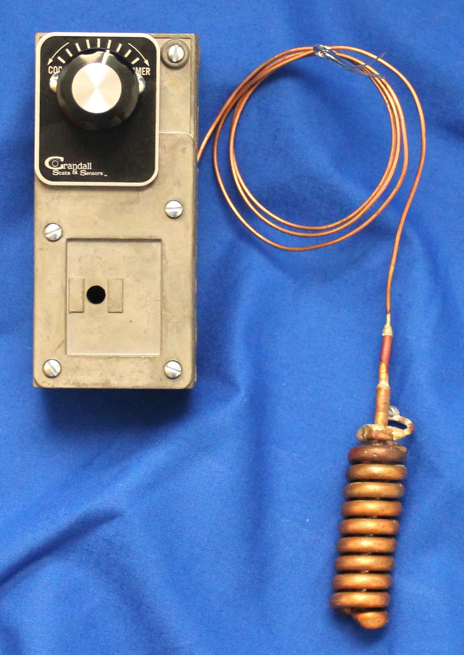 The Crandall TK-3001-CS&S is a pneumatic bulb thermostat designed for single temperature control in two-pipe systems. It operates directly and is field adjustable with a temperature range of sixty degrees Fahrenheit to ninety degrees Fahrenheit. This model includes a coiled bulb measuring one inch by five inches for efficient temperature sensing. The product is suitable for various HVAC applications where precise temperature regulation is needed.